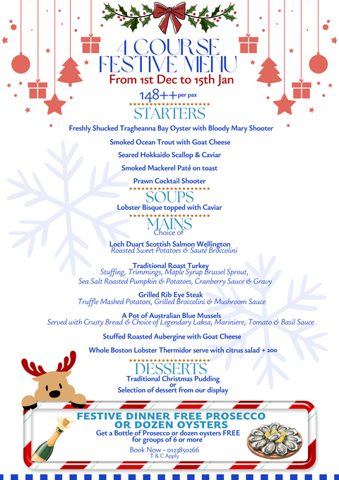 From freshly shucked oysters and luxurious lobster bisque to traditional roast turkey, salmon wellington, ribeye steak, mussels, and indulgent desserts, our festive menu is perfect for family gatherings, friends, and corporate celebrations.